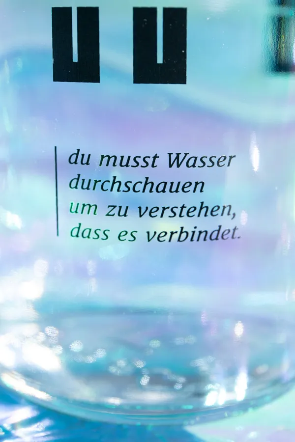 Due to the bottle’s very straight cylindrical shape, the self-imposed challenge came to achieve a nice effect with the refraction of light by looking through the water. After calculating the distortion, the designable area became smaller and smaller, so a minimalist style became handy to achieve the greatest effect.